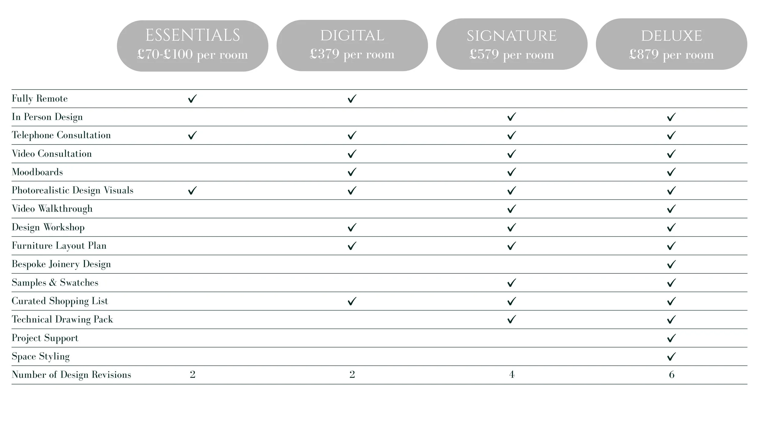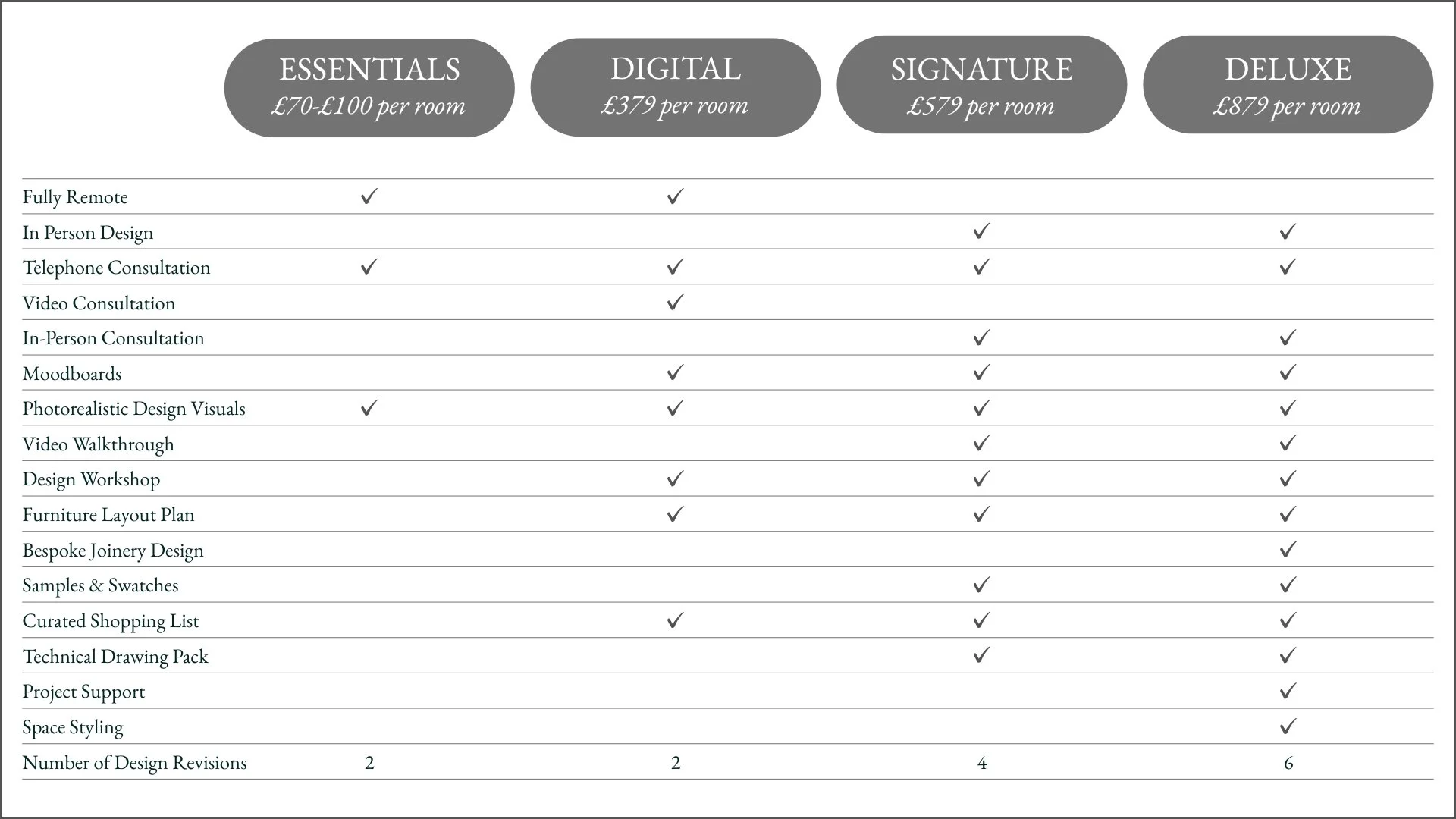 Compare our plans and pricing to decide the right fit for your project… Click on each package below to find out more… ESSENTIALS DIGITAL SIGNATURE DELUXE Complete Online Enquiry Form Book Your Free Telephone Consultation