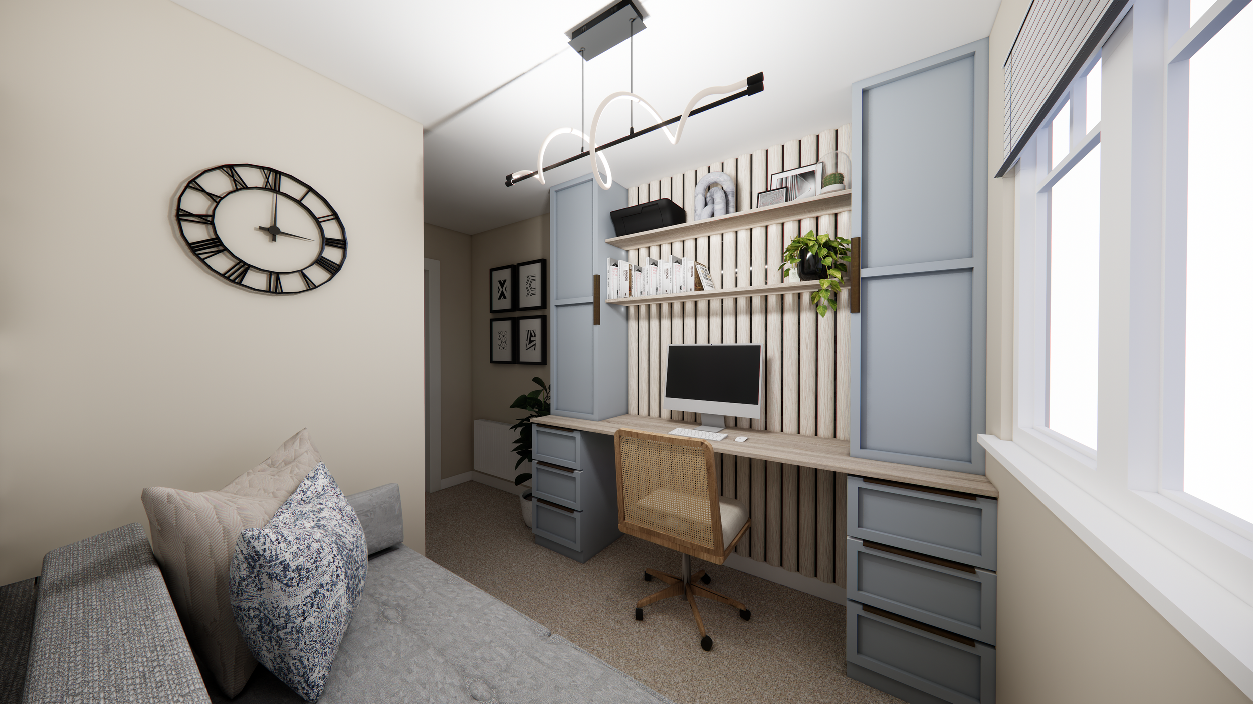 A purposeful, warm home office designed for focus and hospitality. We created bespoke floor-to-ceiling joinery with base drawers, an integrated desk, upper cupboards, and open shelving to maximise storage and keep surfaces uncluttered. The joinery is grounded in a dusty blue palette and detailed with antique brass hardware for a soft, refined contrast. A sweep of curved oak panelling zones the desk with sculptural warmth, while a natural rattan chair adds tactile comfort. A discreet pull-out sofa bed allows the space to double as a spare bedroom for guests, and a tropical wall mural provides a polished, professional backdrop for Zoom meetings. The result is a highly functional, beautifully detailed room that balances workday efficiency with relaxed, lived-in character.