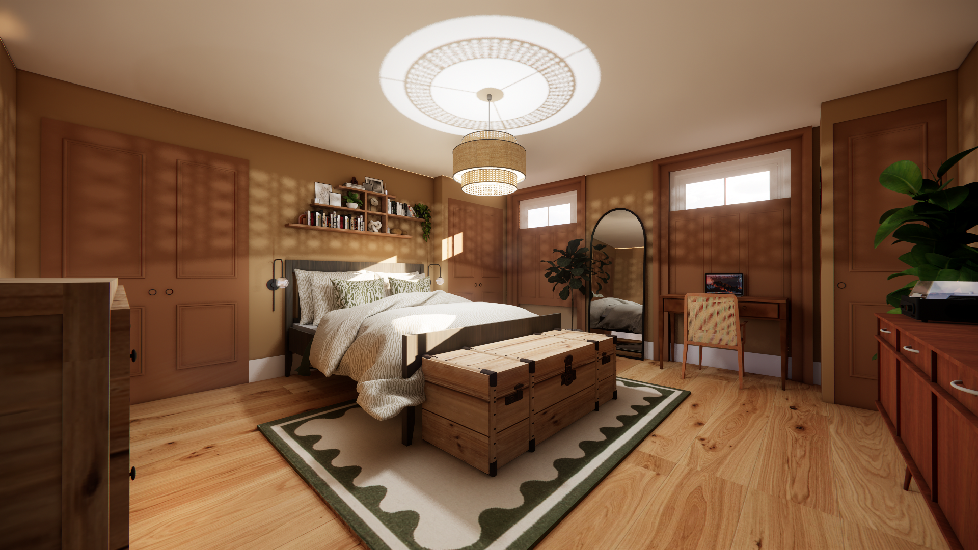 Our clients wanted a warm, grounded bedroom defined by rich terracotta and rust tones. We layered contrasting walls and woodwork with natural timber, anchored the space with a cosy king-sized bed, and tucked a compact home office nook into the plan with soft task lighting. Lush plants, textured linens, and carefully curated lighting complete a layered, inviting retreat that balances drama with everyday comfort.